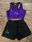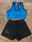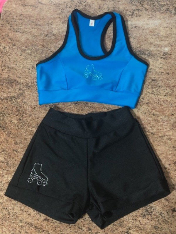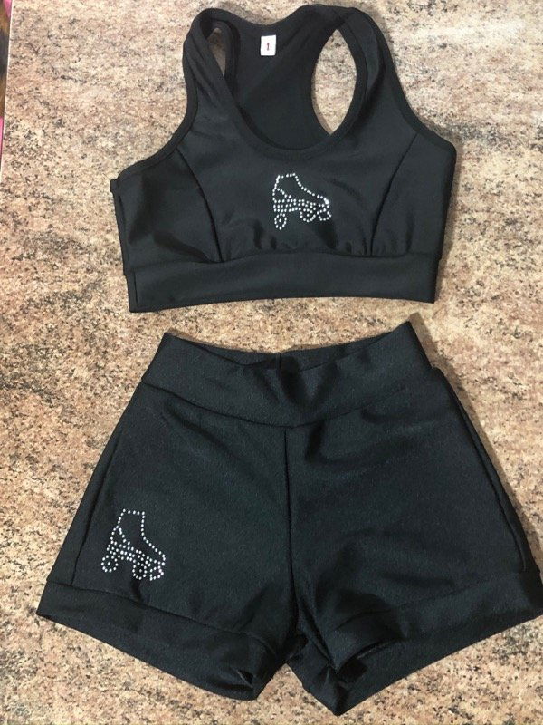 Conjunto de top deportivo y short de lycra. Ambos con detalles de strass con forma de patín artístico.